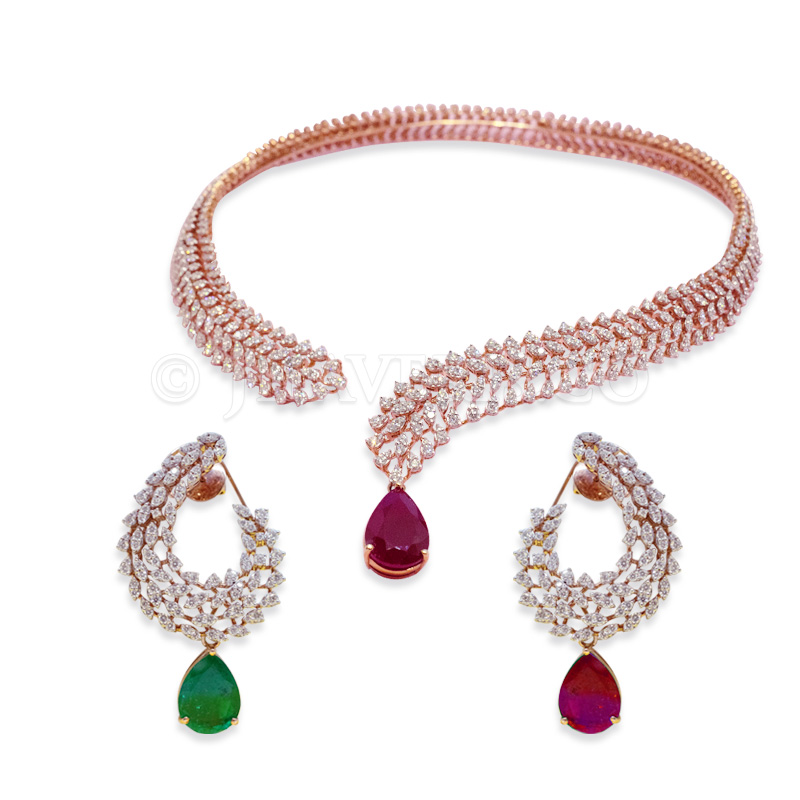 Special Feature: The open collar design, adorned with round-shaped diamonds and striking rubies, creates a radiant and regal effect, making this necklace set a standout accessory that exudes elegance and sophistication.
