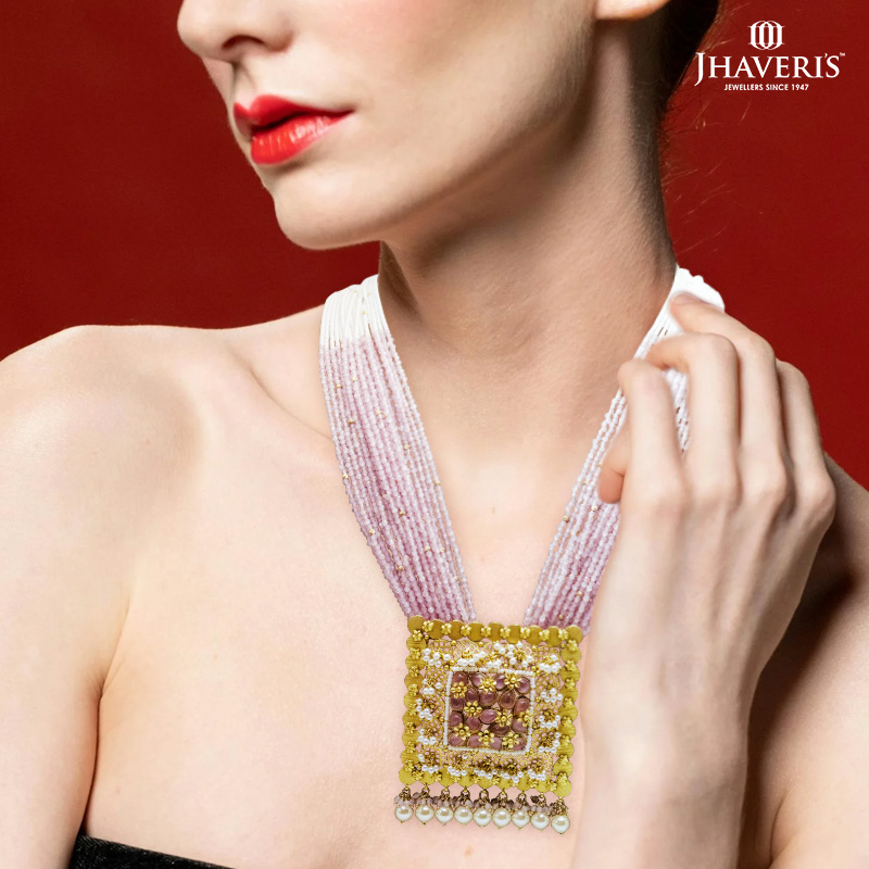 Details: The necklace features intricate goldwork paired with pink tourmaline accents, accompanied by matching earrings for a complete look.