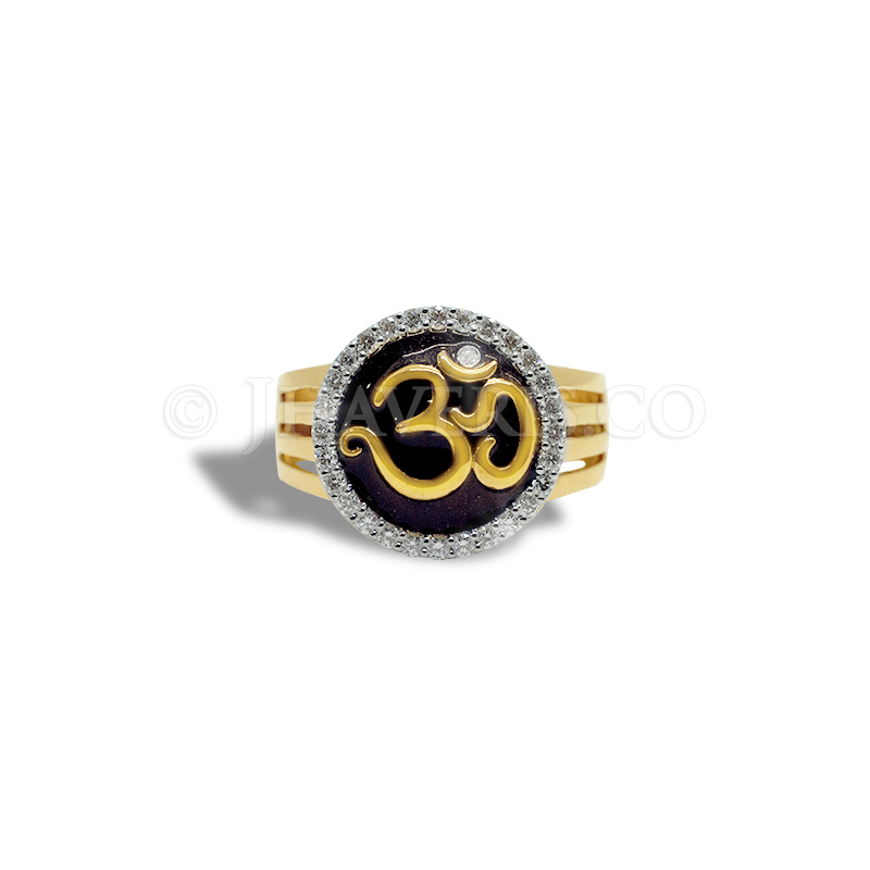 Design: This 18k yellow gold diamond ring features a beautifully designed OM symbol at the center, surrounded by a radiant circle of round-shaped diamonds, exuding spiritual elegance.