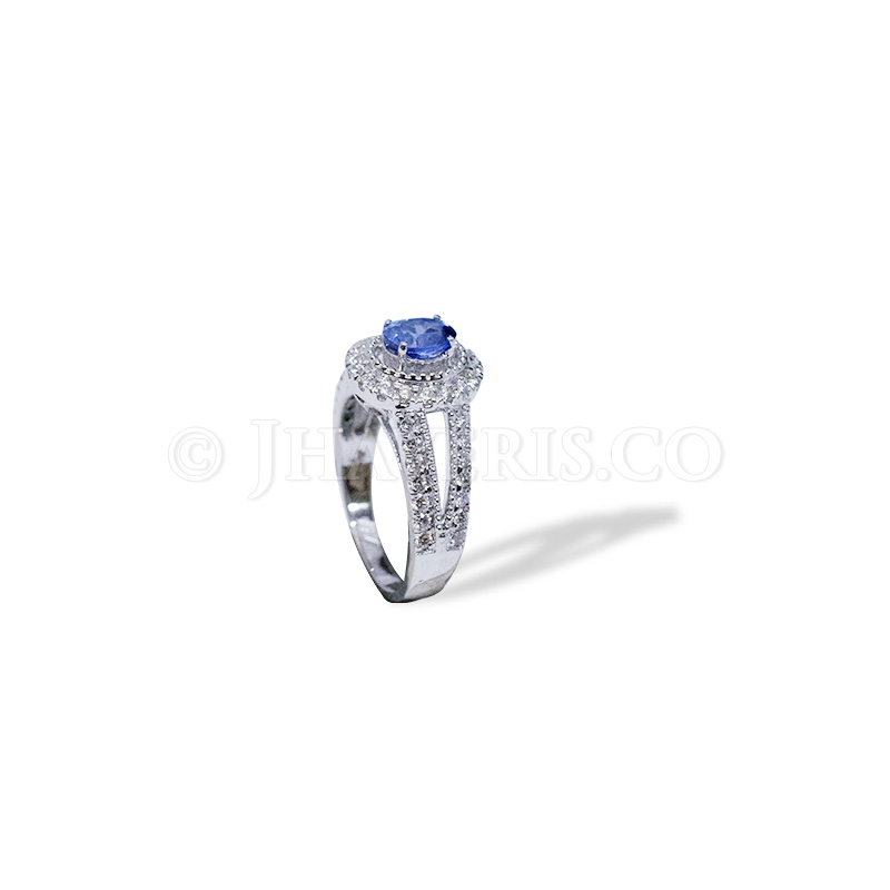 Crafted in lustrous 18K white gold, the setting enhances the brilliance of the diamonds and the rich hue of the sapphire, offering both durability and elegance.