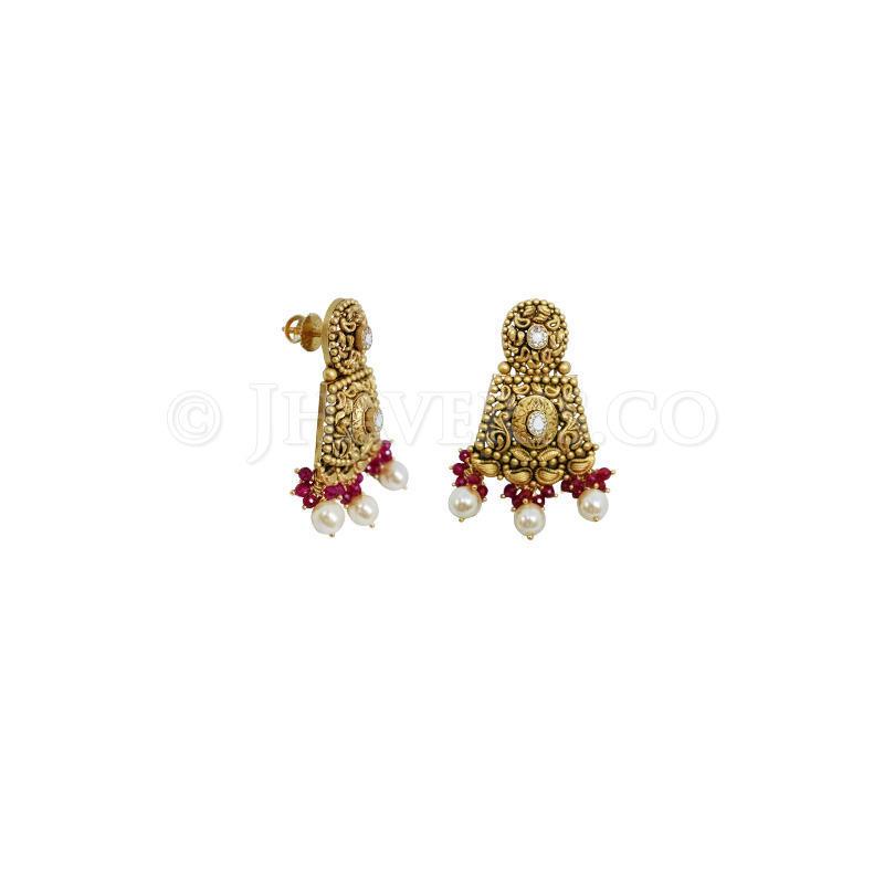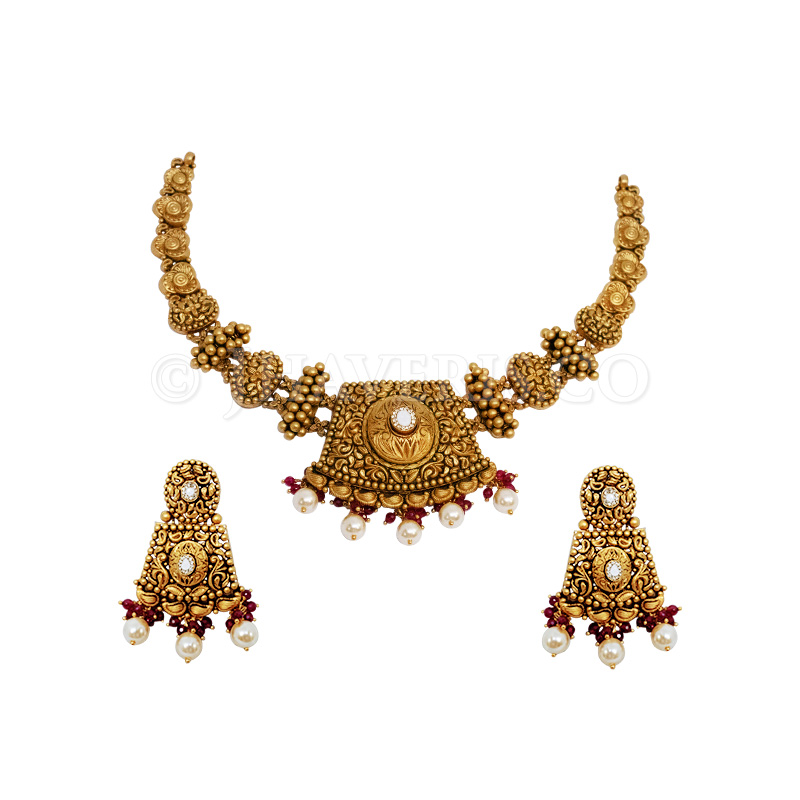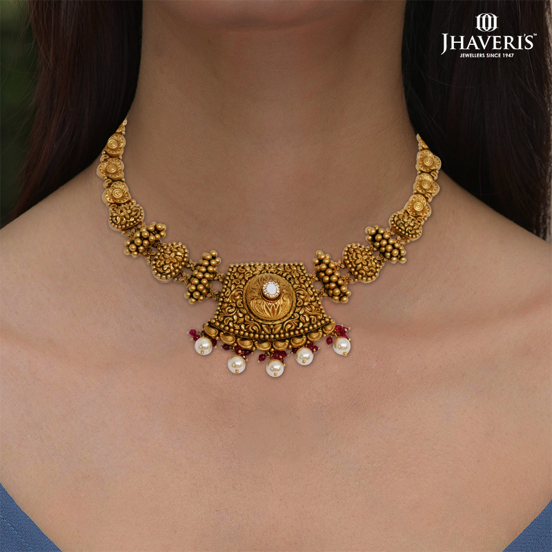 A majestic design inspired by royal heirlooms, this necklace set showcases intricate motifs, temple-inspired carvings, and a regal silhouette. The antique finish enhances its heritage charm, making it a true statement of tradition.