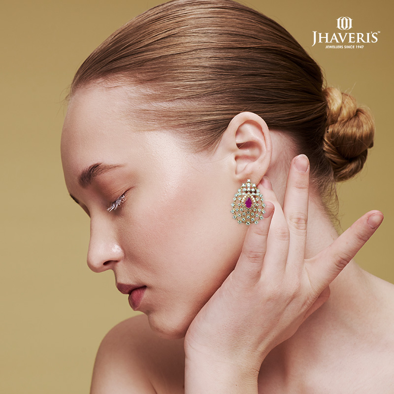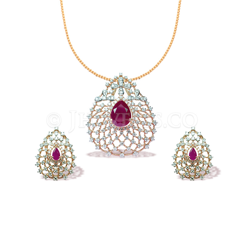 Design: A striking drop-shaped design crafted in 18K gold, featuring a vivid central ruby embraced by a sparkling halo of round-cut diamonds. The pendant and matching earrings exude refined grace with vibrant contrast and timeless brilliance