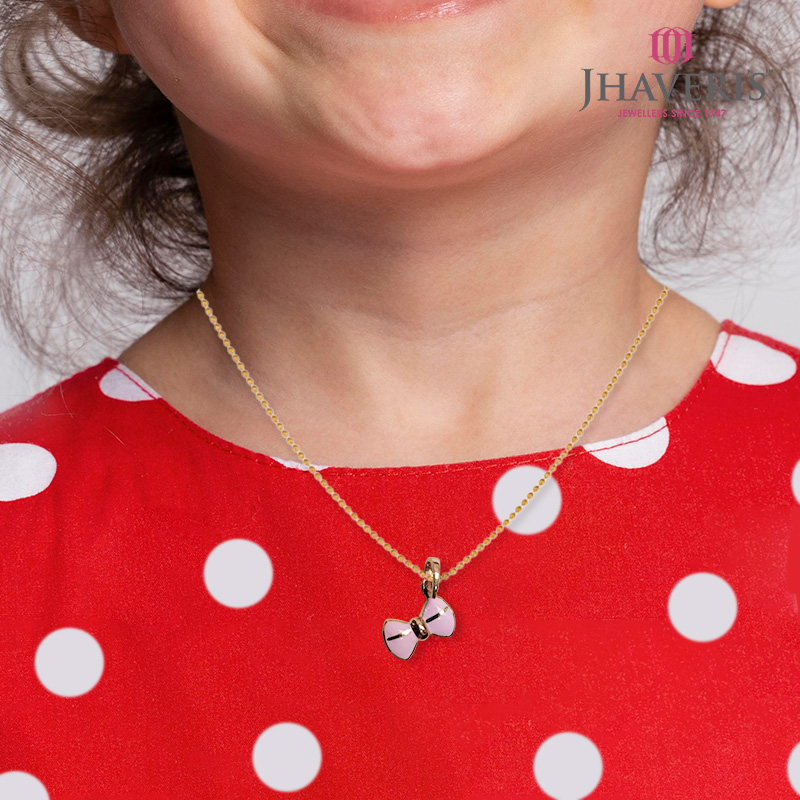 Design: Lovingly crafted in 18K yellow gold, this delicate pendant features a charming pink bow accent — a symbol of sweetness, innocence, and playful elegance, perfect for your little one